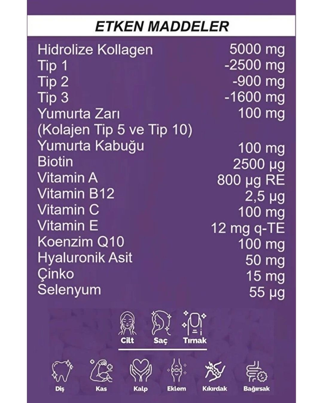 افزایش کشسانی و سفتی پوست, حمایت از سلامت مو و ناخن, تقویت مفاصل و غضروف, بهبود ساختار استخوان, حاوی بیوتین و ویتامینهای ضروری, طعم توت فرنگی خوشمزه, حاوی هیالورونیک اسید و کوآنزیم Q10