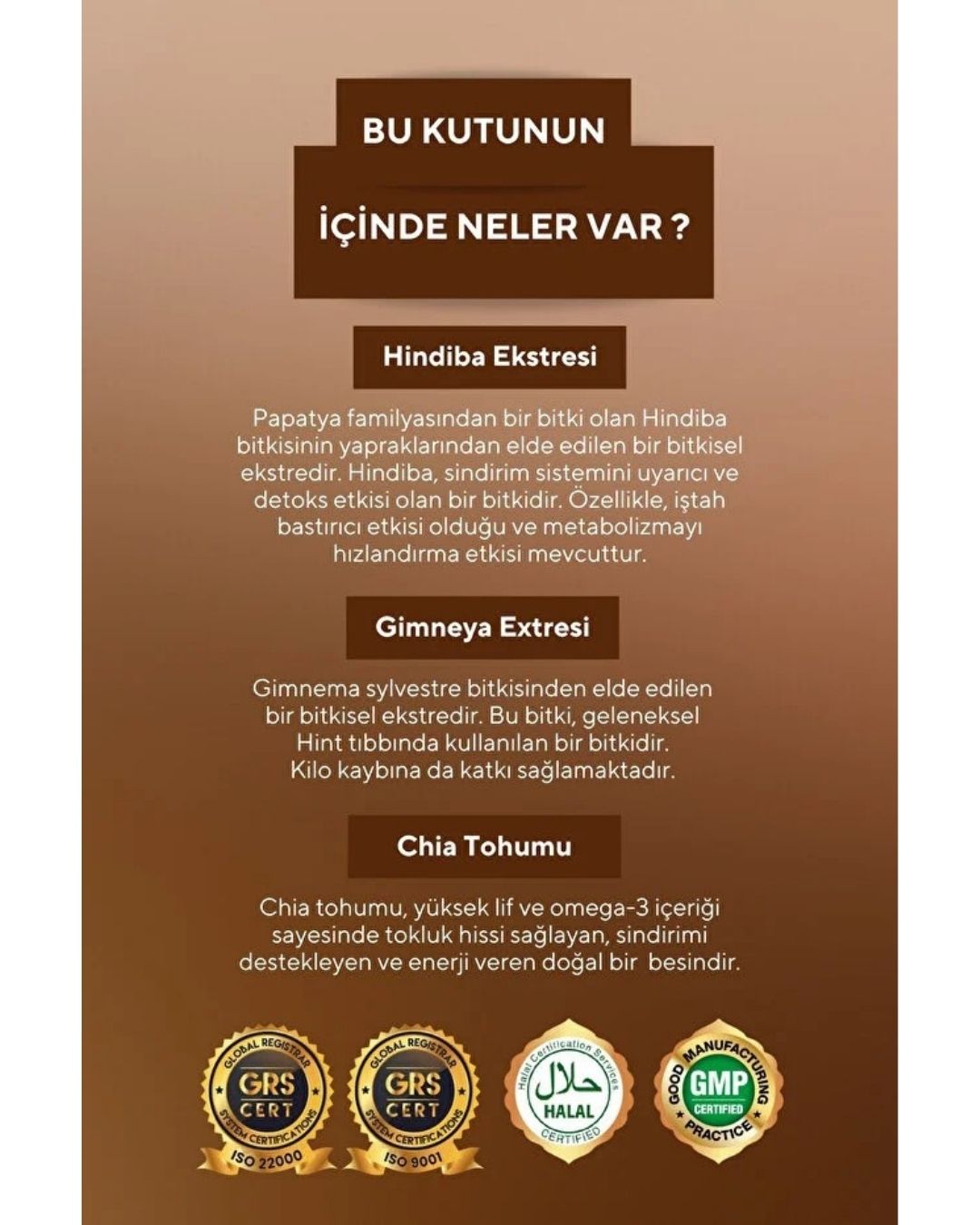 قهوه کاسنی (Hindiba)، عصاره جیمنما (Gymnema)، عصاره دانه چیا، ال-کارنیتین.